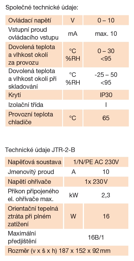 ![]() | Informace Triakové spínače JTR umožňují bezkontaktní spínání elektrického ohřívače. Toto řešení přináší některé výhody: • spolehlivost polovodičových součástek – zařízení nevyžaduje žádnou obsluhu ani zvláštní údržbu • napětí je spínáno při průchodu nulou – minimální rušení do sítě • bezhlučný chod (v porovnání se stykači) • plynulé řízení topného výkonu od 0 do 100% na základě ovládacího napětí 0 až 10 V Přiřazení ohřívačů: • JTR-2-B – 1x230 V do 2,3 kW • JTR-12-1N-B – 1x230 V nebo 2x230 V do 6/12 kW • JTR-12-1N-B – 1x400 V nebo 3x400 V do 12 kW • JTR-18-1-B – 1x400 V nebo 3x400 V do 18 kW • JTR-24-1-B – 3x400 V do 24 kW 3-fázové ohřívače musí být zapojeny do trojúhelníku nebo do hvězdy (střed hvězdy nesmí být připojen ke střednímu vodiči). U ohřívačů na 3x 400 V musí být zátěž rozdělena mezi jednotlivé fáze symetricky, ve všech fázích musí tedy ohřívač odebírat stejný proud. Jmenovitý proud triakového spínače nesmí být překročen. • doporučený typ regulátoru: RSmini EO, UNIREG Poznámka: JTR nejsou potřeba pro MBE … R2 a RME … R. JTR-18-1 má stejné parametry jako JTR-18-1-B, ale jiný způsob řízení výkonu. Prodává se pouze jako příslušenství k RSmini EO 5x30 a RSmini EO 1x30. | |