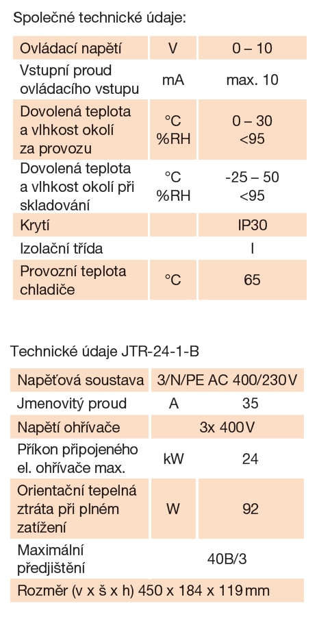 ![]() | Informace Triakové spínače JTR umožňují bezkontaktní spínání elektrického ohřívače. Toto řešení přináší některé výhody: • spolehlivost polovodičových součástek – zařízení nevyžaduje žádnou obsluhu ani zvláštní údržbu • napětí je spínáno při průchodu nulou – minimální rušení do sítě • bezhlučný chod (v porovnání se stykači) • plynulé řízení topného výkonu od 0 do 100% na základě ovládacího napětí 0 až 10 V Přiřazení ohřívačů: • JTR-2-B – 1x230 V do 2,3 kW • JTR-12-1N-B – 1x230 V nebo 2x230 V do 6/12 kW • JTR-12-1N-B – 1x400 V nebo 3x400 V do 12 kW • JTR-18-1-B – 1x400 V nebo 3x400 V do 18 kW • JTR-24-1-B – 3x400 V do 24 kW 3-fázové ohřívače musí být zapojeny do trojúhelníku nebo do hvězdy (střed hvězdy nesmí být připojen ke střednímu vodiči). U ohřívačů na 3x 400 V musí být zátěž rozdělena mezi jednotlivé fáze symetricky, ve všech fázích musí tedy ohřívač odebírat stejný proud. Jmenovitý proud triakového spínače nesmí být překročen. • doporučený typ regulátoru: RSmini EO, UNIREG Poznámka: JTR nejsou potřeba pro MBE … R2 a RME … R. JTR-18-1 má stejné parametry jako JTR-18-1-B, ale jiný způsob řízení výkonu. Prodává se pouze jako příslušenství k RSmini EO 5x30 a RSmini EO 1x30. | |