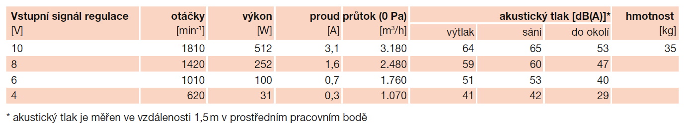 | otáčky [min-1] | výkon [W] | napětí [V] | proud [A] | průtok (0 Pa) [m3/h] | akust. tlak* [dB(A)] | hmotnost [kg] |