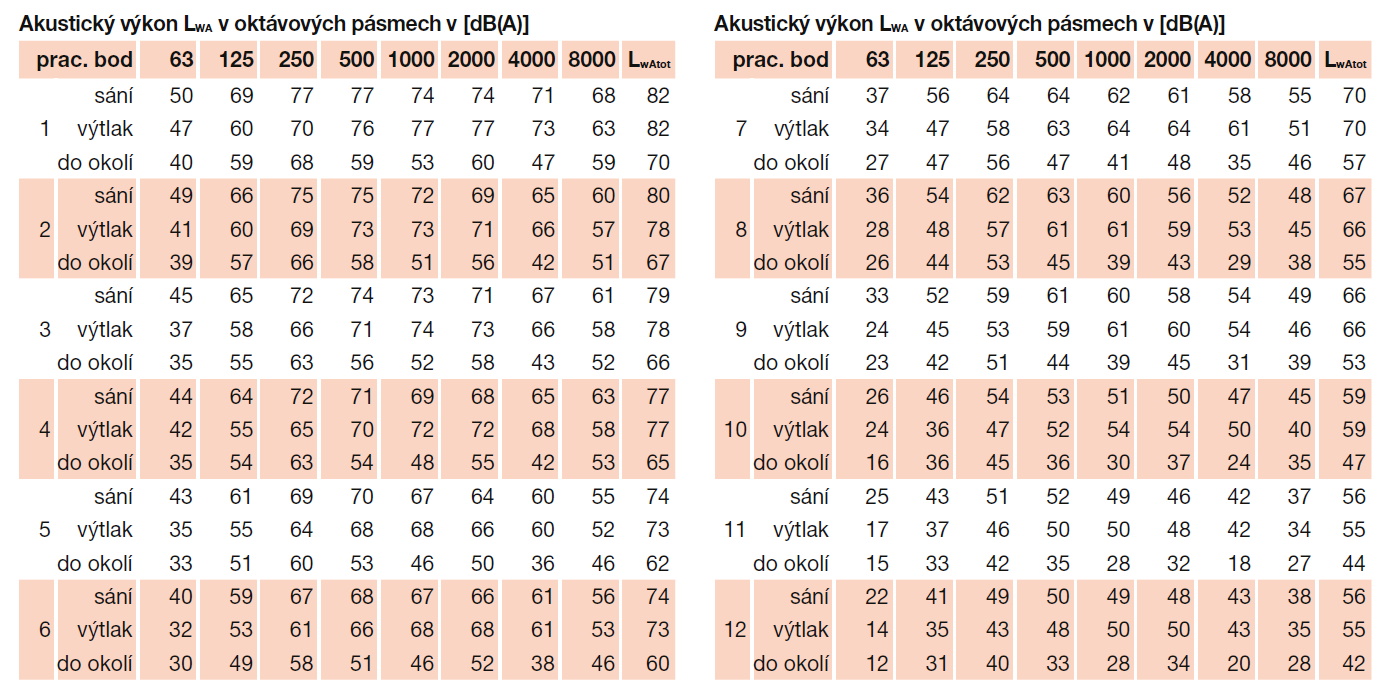 * výtlak / sání / do okolí. Akustický tlak měřen ve vzdálenosti 1,5 m ve 2/3 výkonové charakteristiky.