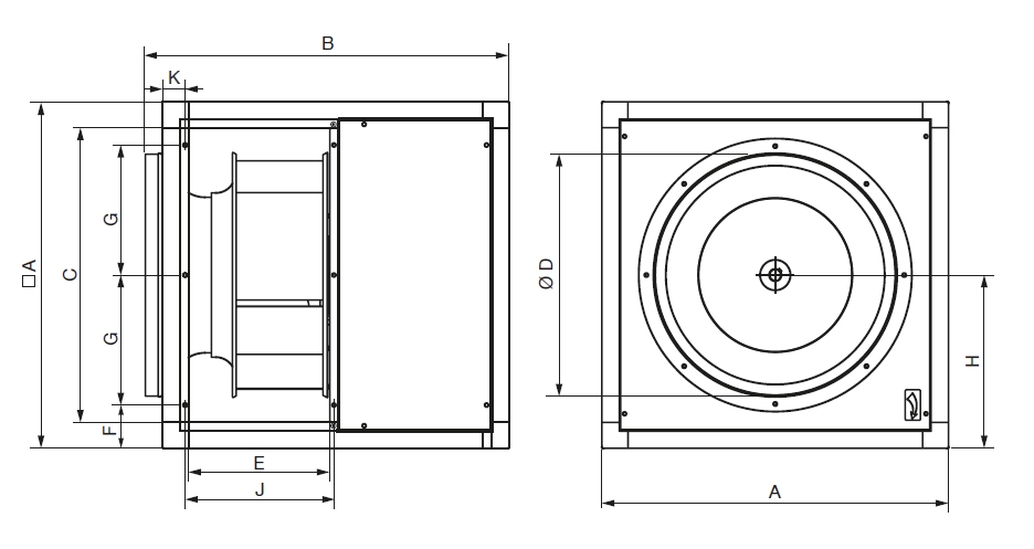 ![]() | Skříň Skříň je z ocelového, galvanicky pozinkovaného plechu, sendvičového provedení. Skříň je uvnitř opatřena vrstvou zvukově izolujícího materiálu. Ventilátor je uložen ve skříni na odpružených profilech, aby se omezil přenos vibrací. Na skříni je osazeno kruhové sací hrdlo pro připojení flexibilních hadic nebo kruhového potrubí. Na výtlaku je čtyřhranný otvor, kam lze připojit redukci na kruhové potrubí, která se dodává samostatně. Skříň obsahuje vanu pro odvod tukového kondenzátu, odvodní hrdlo kondenzátu je nutno namontovat v souladu s polohou ventilátoru a zároveň je nutno zvolit vhodný sklon ventilátoru směrem k hrdlu. | |