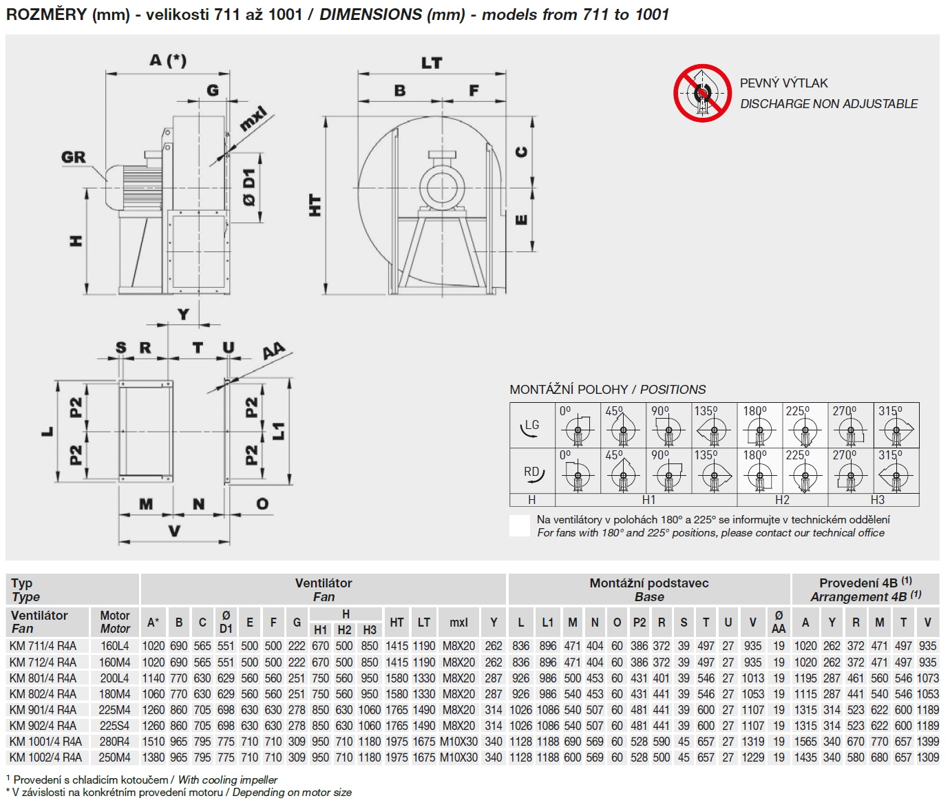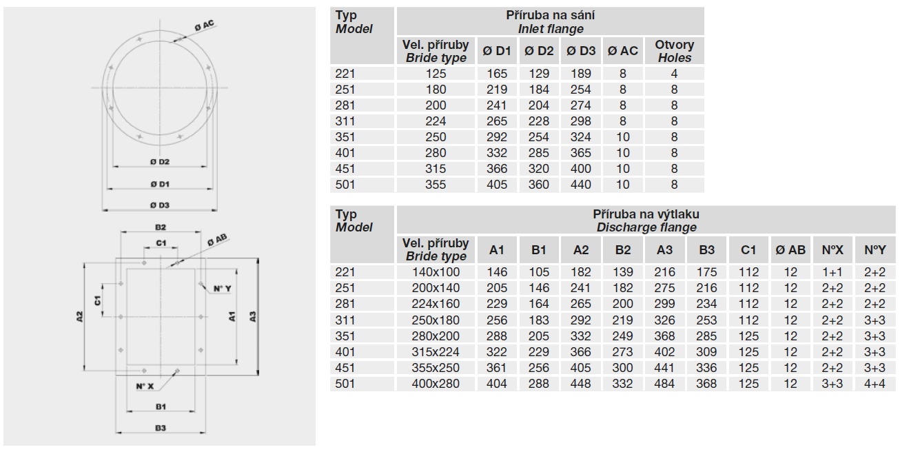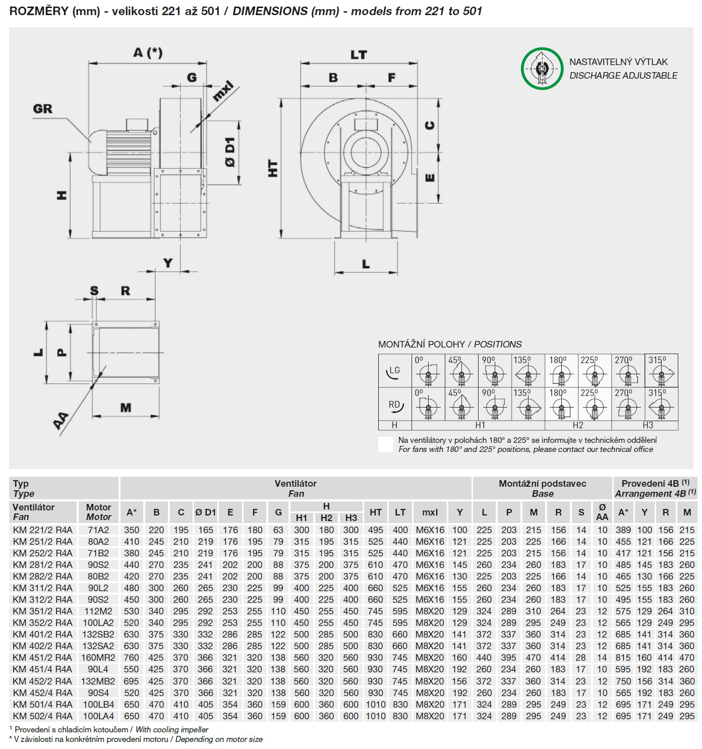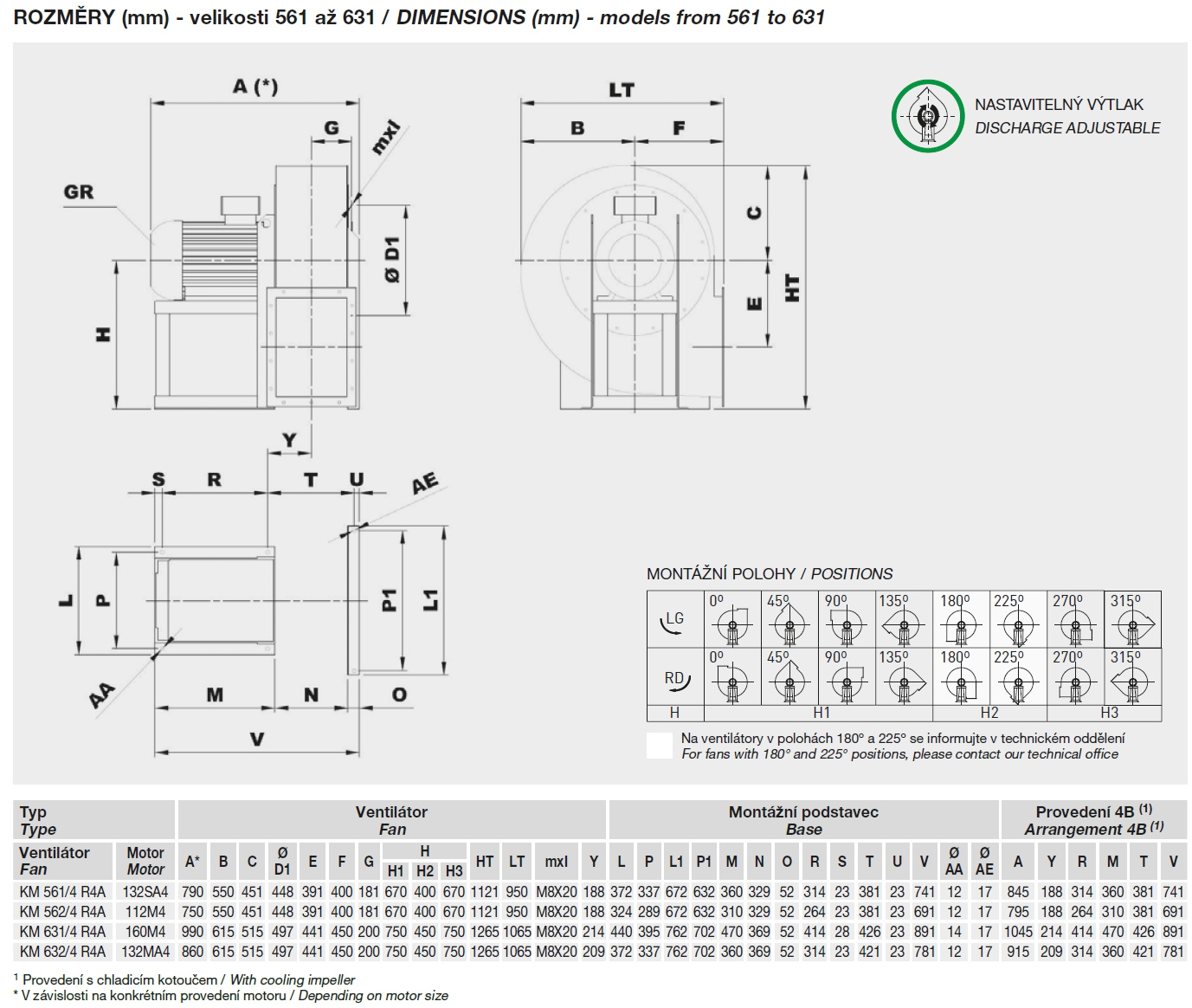 ![]() | Informace Jednostranně sací radiální ventilátor s motorem napřímo. Vyroben z ocelového plechu chráněného kataforezním základním nátěrem a polyuretanovým lakem. Navržen pro trvalý provoz, teplota přepravované vzdušiny od -20 °C do +60 °C. Motory: 2 nebo 4pólové, IE 3* s vysokou účinností, třífázové provedení 230/400 V, 50 Hz do velikosti motoru 132. Pro velikosti motoru nad 132 400/690 V, 50 Hz. Krytí IP55, izolace třídy F. * Od 0,75 kW může být motor IE 2 a řízen frekvenčním měničem. Na vyžádání: • nerez a další materiály • dvourychlostní motory • 60 Hz provedení • lakované v různých barvách RAL • ventilátor bez podstavce (provedení 5) do velikosti motoru 160 • vysokoteplotní provedení (až do 150 °C, provedení B s chladicím kotoučem) • ventilátor s pohonem na spojku (provedení 8) • revizní dvířka, odvod kondenzátu, ucpávka hřídele • svařovaná spirální skříň • tepelně izolovaná spirální skříň ATEX provedení: Na vyžádání možnost dodání v nevýbušném provedení podle směrnice ATEX pro třífázové motory a pro okolní atmosférické podmínky definované normou EN 14986. Rozsah teplot -20 °C až +60 °C, absolutní tlak 0,8 až 1,1 bar. • Plyn: 2G IIB T2-T3-T4, motor ExdIIB nebo ExeII 2G IIB+H2 T2-T3-T4, motor ExdIIC 3G IIB T2-T3-T4, motor ExnA (pouze pro zónu 3G) 3G IIB+H2 T2-T3-T4, motor ExnA (pouze pro zónu 3G) • Nevodivý prach: 2D IIIB T125°C-T135°C-T195°CT295°C 3D IIIB T125°C-T135°C-T195°CT295°C • Vodivý prach (povinný motor IP65): 2D IIIC T125°C-T135°C-T195°CT295°C 3D IIIC T125°C-T135°C-T195°CT295°C | |