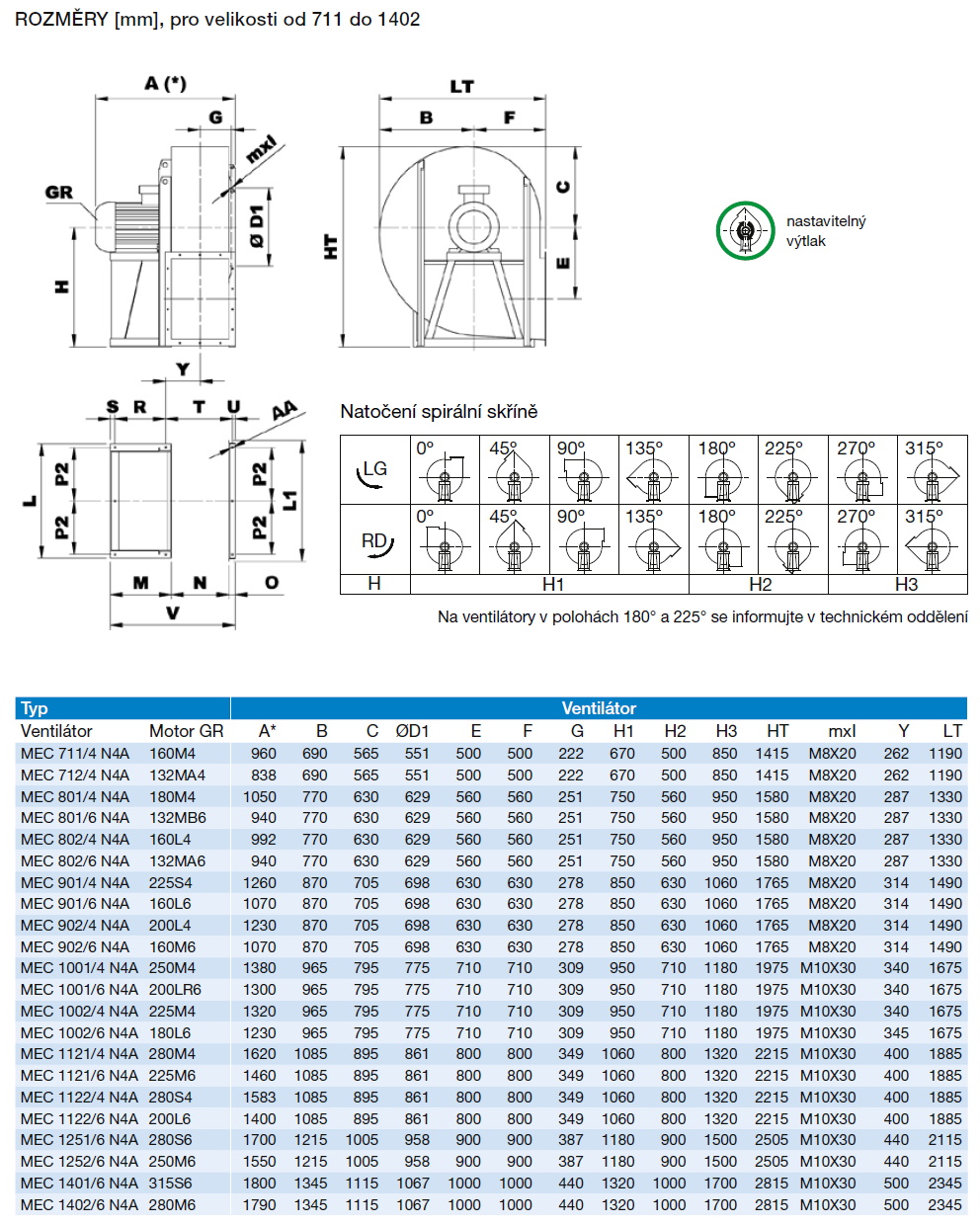 * s připojeným potrubím na straně výtlaku, tolerance úrovně hluku +3 dB(A), měřeno v bodě maximální účinnosti; ** včetně motoru a pro montážní polohy LG270 nebo RD270; *** moment setrvačnosti oběžného kola