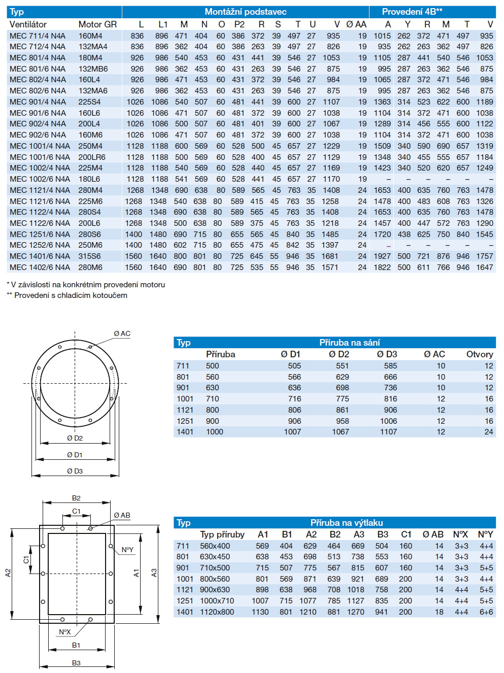 ![]() | Informace Jednostranně sací radiální ventilátor s motorem napřímo. Vyroben z ocelového plechu chráněného kataforezním základním nátěrem a polyuretanovým lakem. Navržen pro trvalý provoz, teplota přepravované vzdušiny od -20 °C do +60 °C. Motory: 2, 4 nebo 6pólové, IE 3* s vysokou účinností, třífázové provedení 230/400 V, 50 Hz do velikosti motoru 132. Pro velikosti motoru nad 132 400/690 V, 50 Hz. Krytí IP55, izolace třídy F. Všechny motory lze regulovat FM. Na vyžádání: • nerez AISI304, AISI316, CORTEN, CREUSABRO 4800 a další materiály • 60 Hz provedení • lakované v různých barvách RAL • ventilátor bez podstavce (provedení 5) do velikosti motoru 160 • vysokoteplotní provedení (až do 220 °C, provedení B s chladicím kotoučem), do 300 °C provedení 8 nebo 12 • ventilátor s pohonem na spojku (provedení 8) nebo na řemen (provedení 12) • revizní dvířka, odvod kondenzátu, ucpávka hřídele, antivibrační sada, nátrubek pro odvod kondenzátu, ochranná mřížka na sání, plynotěsné provedení, provedení s vyšší otěruvzdorností, svařovaná spirální skříň, tepelně izolovaná spirální skříň ATEX provedení: Na vyžádání možnost dodání v nevýbušném provedení podle směrnice ATEX pro třífázové motory a pro okolní atmosférické podmínky definované normou EN 14986. Rozsah teplot -20 °C až +60 °C, absolutní tlak 0,8 až 1,1 bar. • Plyn: 2G IIB T2-T3-T4, motor ExdIIB nebo ExeII 2G IIB+H2 T2-T3-T4, motor ExdIIC 3G IIB T2-T3-T4, motor ExnA (pouze pro zónu 3G) 3G IIB+H2 T2-T3-T4, motor ExnA (pouze pro zónu 3G) • Nevodivý prach: 2D IIIB T125°C-T135°C-T195°CT295°C 3D IIIB T125°C-T135°C-T195°CT295°C • Vodivý prach (povinný motor IP65): 2D IIIC T125°C-T135°C-T195°CT295°C 3D IIIC T125°C-T135°C-T195°CT295°C | |