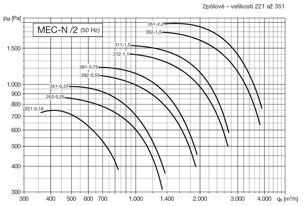 | velikost motoru | otáčky [min-1] | příkon motoru [kW] | max. proud při 400 V [A] | max. průtok [m3/h] | akust. tlak (1 m)* [dB(A)] | hmotnost** [kg] | moment setrvačnosti*** [kgm2] |