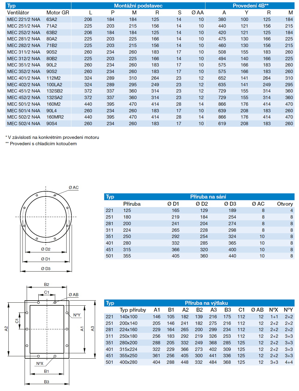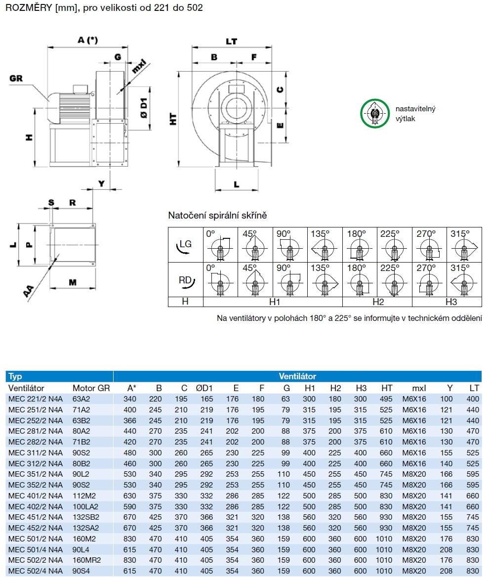 ![]() | Informace Jednostranně sací radiální ventilátor s motorem napřímo. Vyroben z ocelového plechu chráněného kataforezním základním nátěrem a polyuretanovým lakem. Navržen pro trvalý provoz, teplota přepravované vzdušiny od -20 °C do +60 °C. Motory: 2, 4 nebo 6pólové, IE 3* s vysokou účinností, třífázové provedení 230/400 V, 50 Hz do velikosti motoru 132. Pro velikosti motoru nad 132 400/690 V, 50 Hz. Krytí IP55, izolace třídy F. Všechny motory lze regulovat FM. Na vyžádání: • nerez AISI304, AISI316, CORTEN, CREUSABRO 4800 a další materiály • 60 Hz provedení • lakované v různých barvách RAL • ventilátor bez podstavce (provedení 5) do velikosti motoru 160 • vysokoteplotní provedení (až do 220 °C, provedení B s chladicím kotoučem), do 300 °C provedení 8 nebo 12 • ventilátor s pohonem na spojku (provedení 8) nebo na řemen (provedení 12) • revizní dvířka, odvod kondenzátu, ucpávka hřídele, antivibrační sada, nátrubek pro odvod kondenzátu, ochranná mřížka na sání, plynotěsné provedení, provedení s vyšší otěruvzdorností, svařovaná spirální skříň, tepelně izolovaná spirální skříň ATEX provedení: Na vyžádání možnost dodání v nevýbušném provedení podle směrnice ATEX pro třífázové motory a pro okolní atmosférické podmínky definované normou EN 14986. Rozsah teplot -20 °C až +60 °C, absolutní tlak 0,8 až 1,1 bar. • Plyn: 2G IIB T2-T3-T4, motor ExdIIB nebo ExeII 2G IIB+H2 T2-T3-T4, motor ExdIIC 3G IIB T2-T3-T4, motor ExnA (pouze pro zónu 3G) 3G IIB+H2 T2-T3-T4, motor ExnA (pouze pro zónu 3G) • Nevodivý prach: 2D IIIB T125°C-T135°C-T195°CT295°C 3D IIIB T125°C-T135°C-T195°CT295°C • Vodivý prach (povinný motor IP65): 2D IIIC T125°C-T135°C-T195°CT295°C 3D IIIC T125°C-T135°C-T195°CT295°C | |