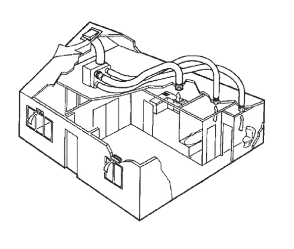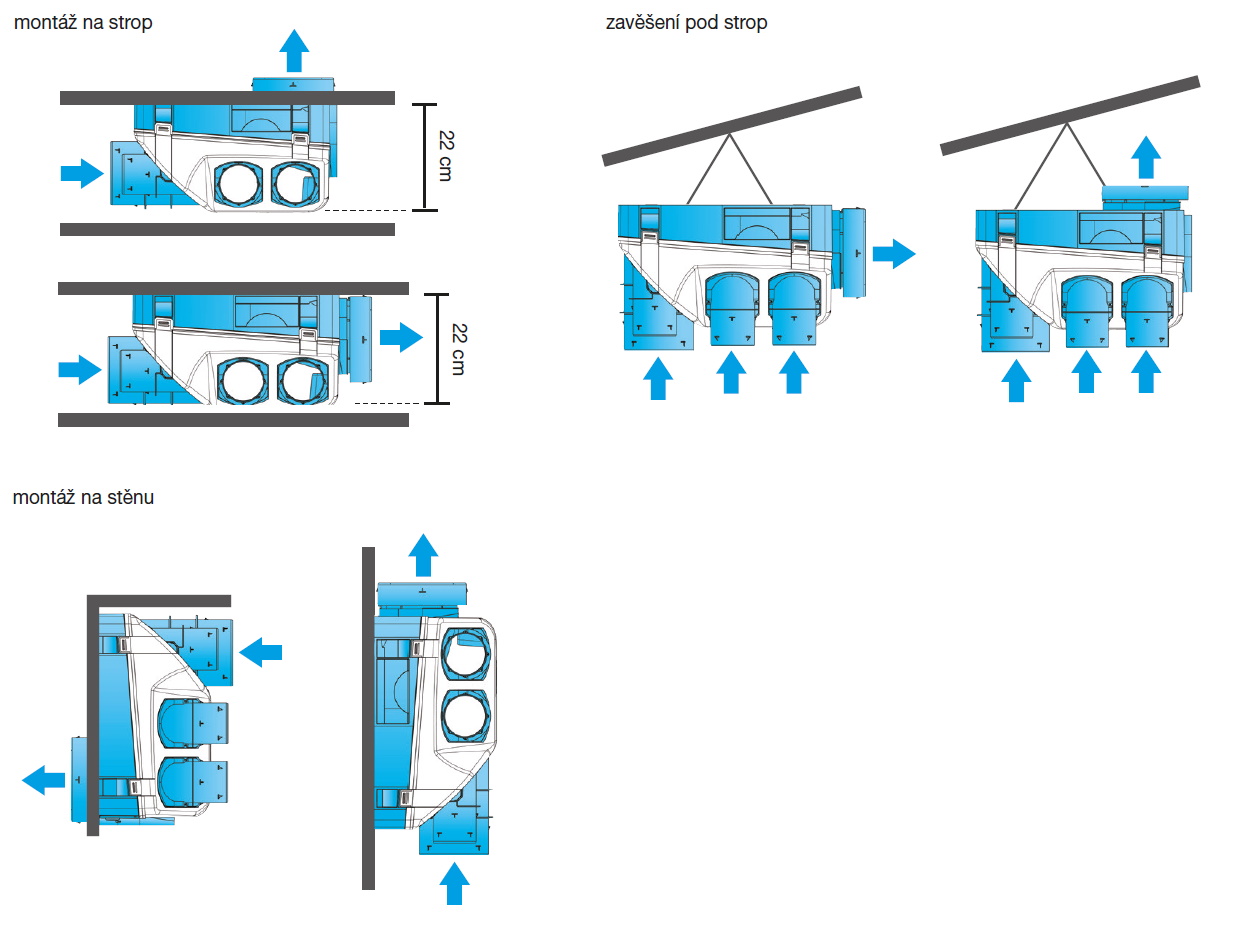 ![]() | Montáž Montáž se provádí na stěnu, strop nebo zavěšením pod strop. Nevyužitá sací hrdla se musí opatřit záslepkami, které jsou součástí dodávky. Na sací a výtlačné hrdlo musí být připojeno potrubí min. délky 0,9 m. | |