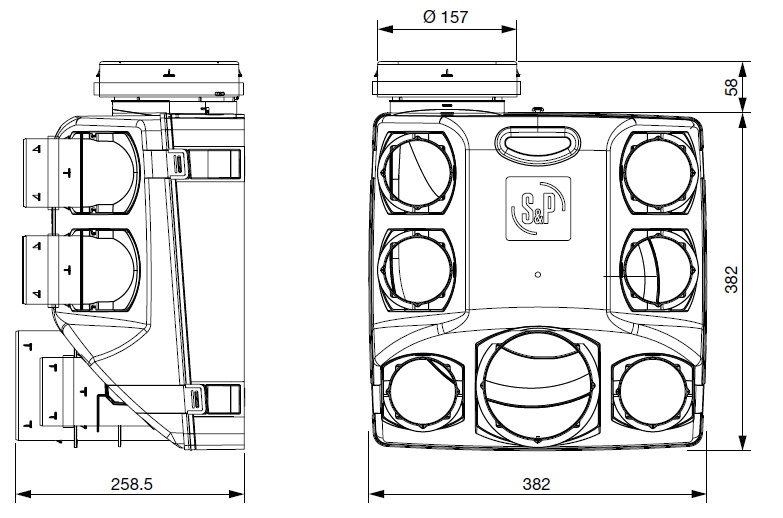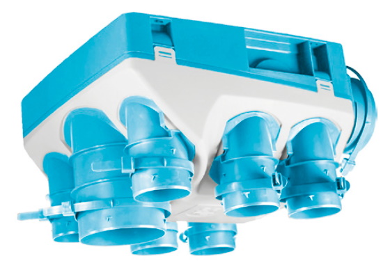 ![]() | Skříň Skříň je vyrobena z plastu bílé barvy se zelenou základnou a hrdly. Na skříni je 6 sacích hrdel Ø 80 mm, 1 sací hrdlo Ø 125 mm a jedno výtlačné Ø 125 mm. 4 sací hrdla jsou standardně opatřena záslepkami. Hrdla mohou být natáčena o 90°. Základnu s motorem lze snadno vyjmout pro účely čištění a revizí. | |