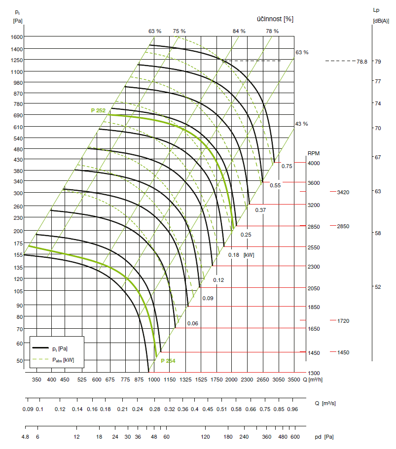 ![]() | Hluk Hladina akustického tlaku ve vzdálenosti 1,5 m ve volném akustickém poli se odečte na stupnici Lp výkonového diagramu z průsečíku křivky otáček a přímky nejvyšší účinnosti. Akustický výkon v jednotlivých oktávových pásmech pro různé hodnoty otáček je uveden v tabulce pod diagramem. Hodnoty jsou měřeny s tolerancí ±3 dB. | |