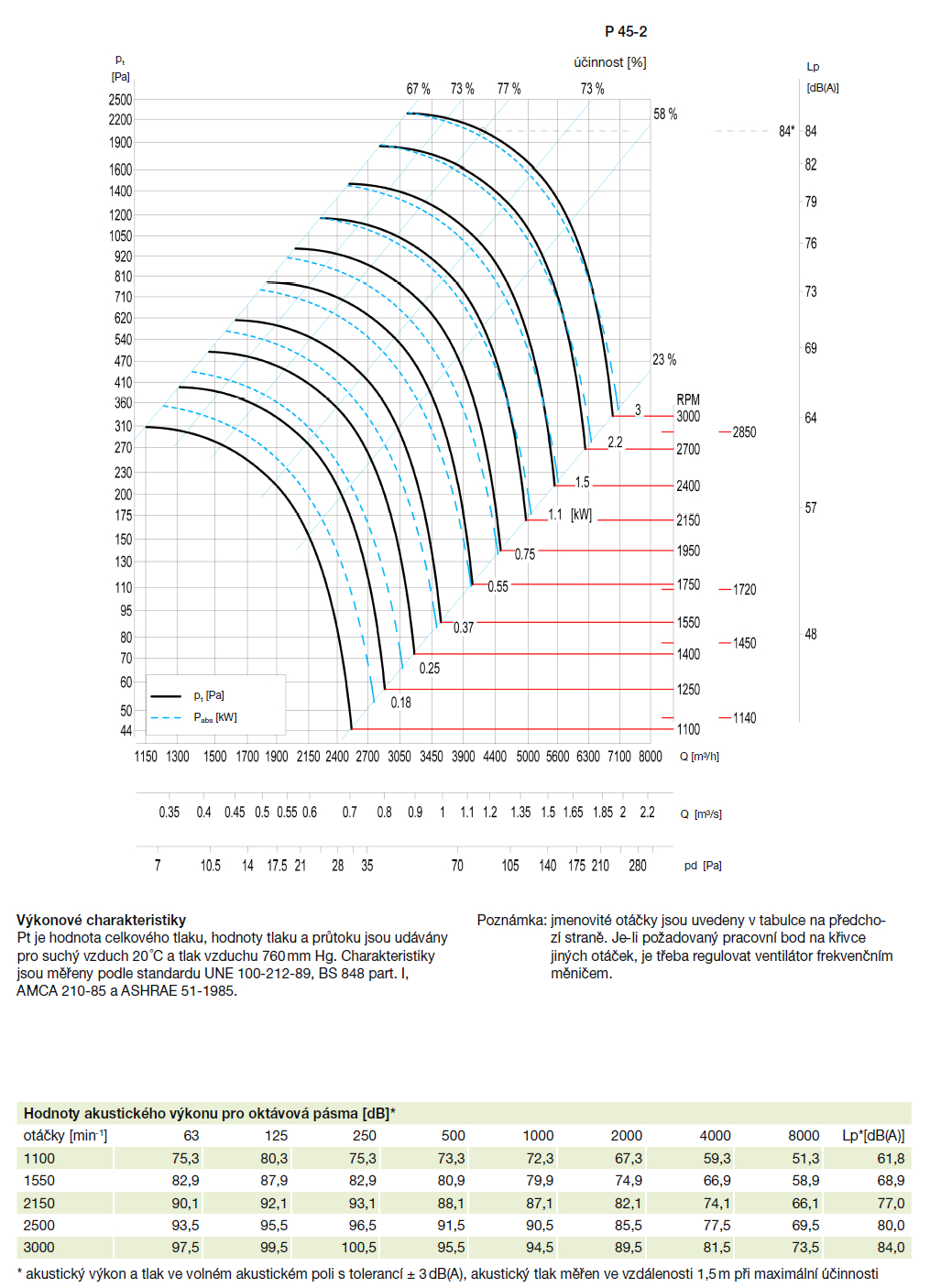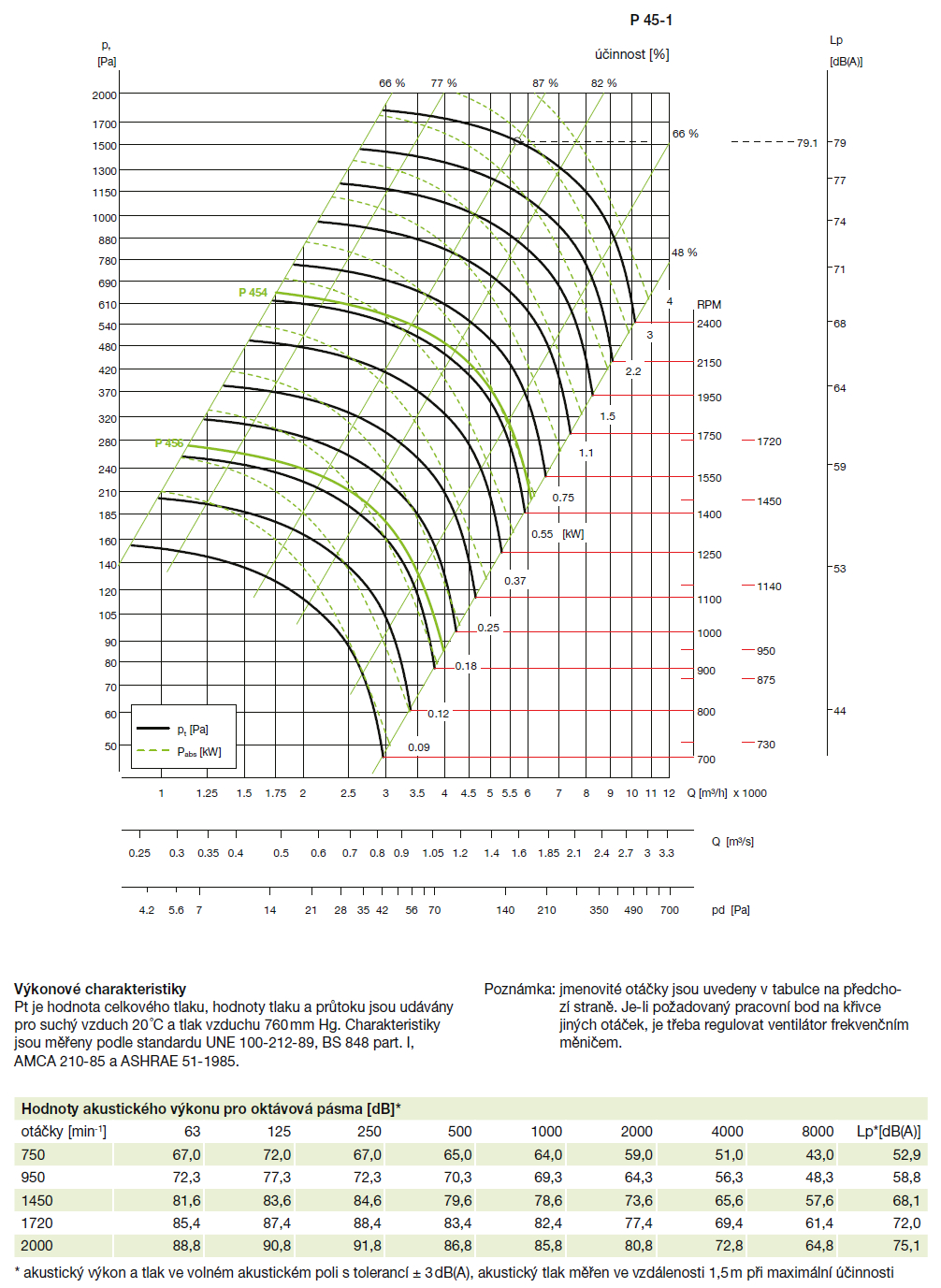![]() | Hluk Hladina akustického tlaku ve vzdálenosti 1,5 m ve volném akustickém poli se odečte na stupnici Lp výkonového diagramu z průsečíku křivky otáček a přímky nejvyšší účinnosti. Akustický výkon v jednotlivých oktávových pásmech pro různé hodnoty otáček je uveden v tabulce pod diagramem. Hodnoty jsou měřeny s tolerancí ±3 dB. | |