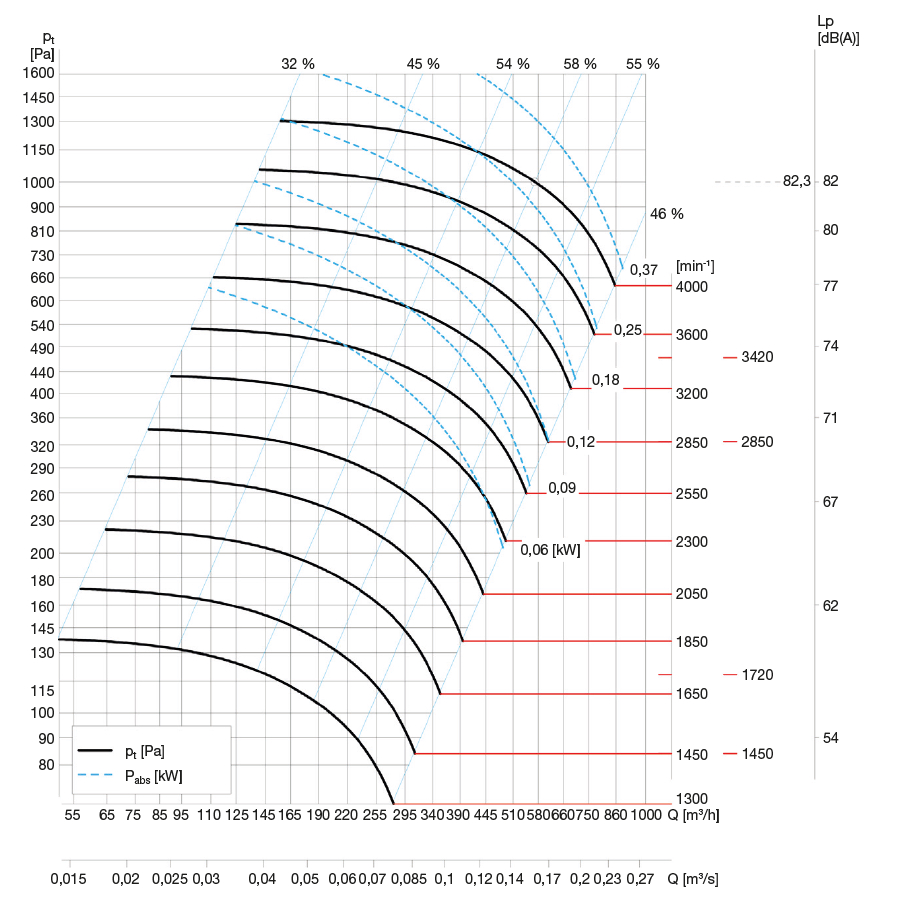 ![]() | Hluk Hladina akustického tlaku ve vzdálenosti 1,5 m ve volném akustickém poli se odečte na stupnici Lp výkonového diagramu z průsečíku křivky otáček a přímky nejvyšší účinnosti. Akustický výkon v jednotlivých oktávových pásmech pro různé hodnoty otáček je uveden v tabulce pod diagramem. Hodnoty jsou měřeny s tolerancí ±3 dB. | |