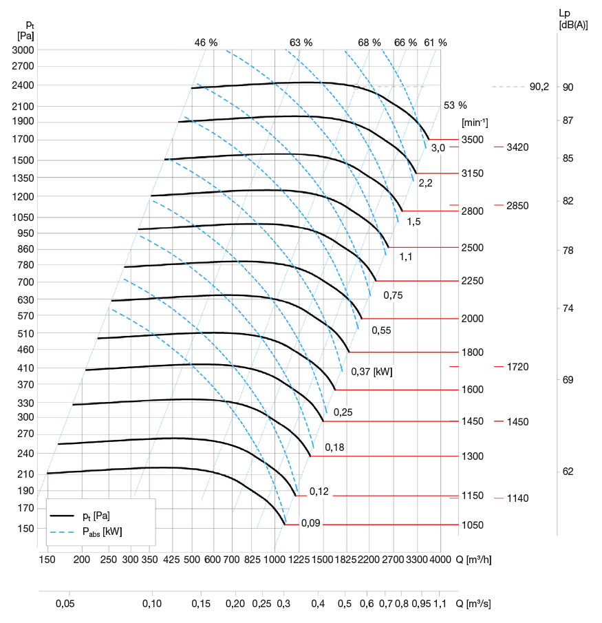 ![]() | Hluk Hladina akustického tlaku ve vzdálenosti 1,5 m ve volném akustickém poli se odečte na stupnici Lp výkonového diagramu z průsečíku křivky otáček a přímky nejvyšší účinnosti. Akustický výkon v jednotlivých oktávových pásmech pro různé hodnoty otáček je uveden v tabulce pod diagramem. Hodnoty jsou měřeny s tolerancí ±3 dB. | |