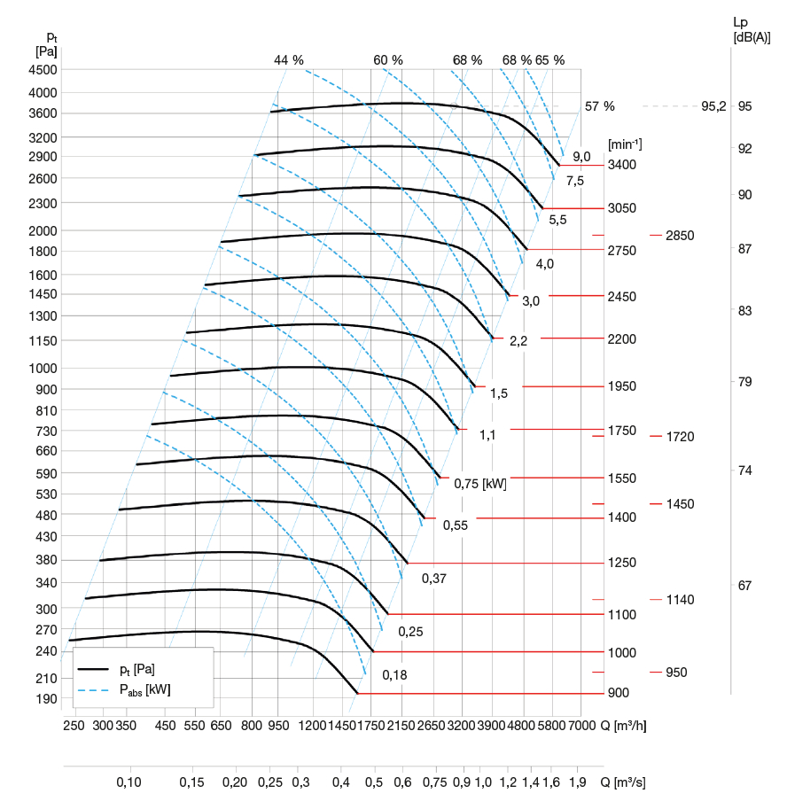 ![]() | Hluk Hladina akustického tlaku ve vzdálenosti 1,5 m ve volném akustickém poli se odečte na stupnici Lp výkonového diagramu z průsečíku křivky otáček a přímky nejvyšší účinnosti. Akustický výkon v jednotlivých oktávových pásmech pro různé hodnoty otáček je uveden v tabulce pod diagramem. Hodnoty jsou měřeny s tolerancí ±3 dB. | |