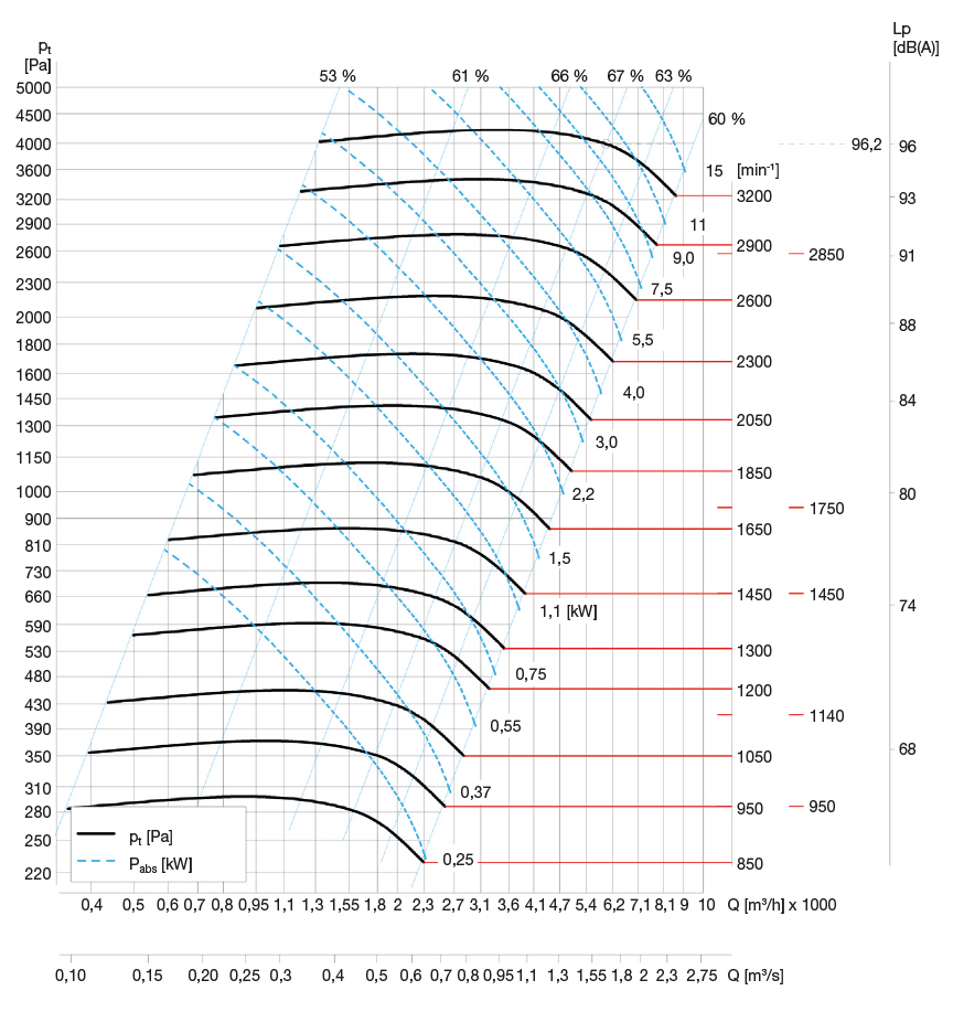 ![]() | Hluk Hladina akustického tlaku ve vzdálenosti 1,5 m ve volném akustickém poli se odečte na stupnici Lp výkonového diagramu z průsečíku křivky otáček a přímky nejvyšší účinnosti. Akustický výkon v jednotlivých oktávových pásmech pro různé hodnoty otáček je uveden v tabulce pod diagramem. Hodnoty jsou měřeny s tolerancí ±3 dB. | |