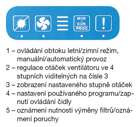 ![]() | Regulace Regulace otáček je 4-stupňová, programovatelná (10 týdenních přednastavených programů nebo 2 individuální nastavitelné). Dotykové ovládání je umístěno na přední straně jednotky. Volitelně je k dispozici bezdrátové ovládání nebo ovládání nadřazeným systémem (BMS). Nainstalováním softwaru iFLOW (smartphone, notebook) lze jednotky ovládat chytrým telefonem či tabletem. Jednotku je možno vybavit senzory pro udržení požadované kvality ovzduší (vlhkosti, teploty, CO2, VOC). | |
