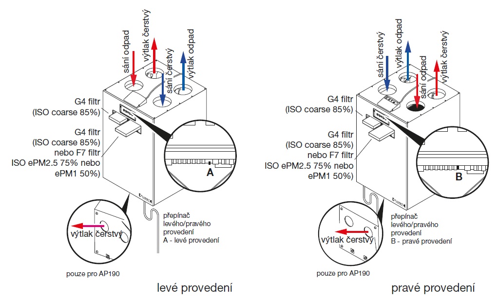 ![]() | Skříň Skříň je vyrobena z ocelového galvanicky pozinkovaného plechu a je nalakována práškovou barvou v šedobílé kombinaci. Vnitřní konstrukce je z vysoce kvalitního pěnového EPS. Na horní straně jednotky jsou 4 hrdla o průměru dle velikosti jednotky. Jednotka AP190 má navíc jedno hrdlo pro sání na spodní straně skříně. Pravé nebo levé provedení získáme přepnutím přepínače na čelní straně jednotky po sejmutí předního krytu. | |