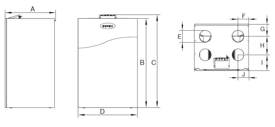 ![]() | Montáž Jednotka je určena k vertikální montáži do vnitřních prostor, na stěnu či podlahu (součástí dodávky je ocelový pozední rám). Jednotka musí být namontována tak, aby byl zajištěn dostatek prostoru pro otevření víka jednotky, výměnu filtrů, připojení odvodu kondenzátu na odpad se sifonovým pachovým uzávěrem a pro provádění periodických revizí elektroinstalace. | |