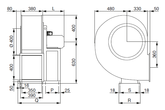 ![]() | Upozornění Materiál skříně a kola lze volit v uvedeném rozsahu podle potřeby konkrétního projektu a je třeba jej uvést ve specifikaci ventilátoru. | |