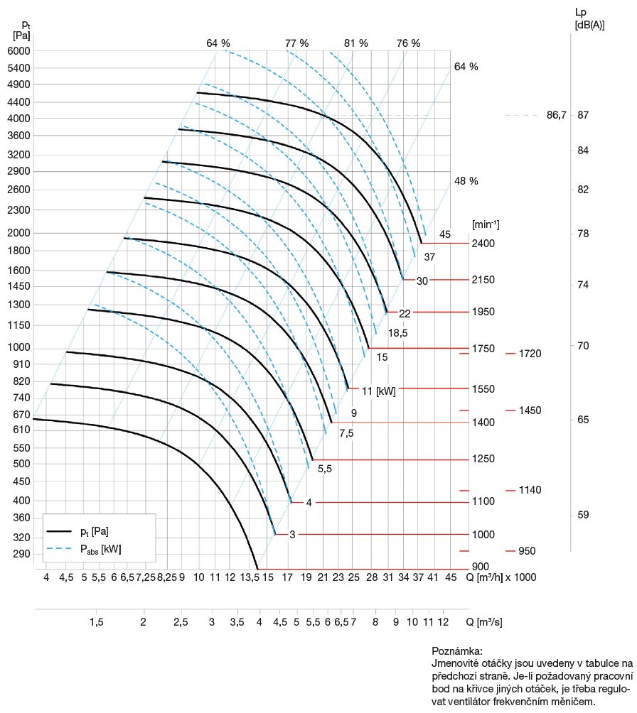 Jmenovité otáčky jsou uvedeny v tabulce. Je-li požadovaný pracovní bod na křivce jiných otáček, je třeba regulovat ventilátor frekvenčním měničem.