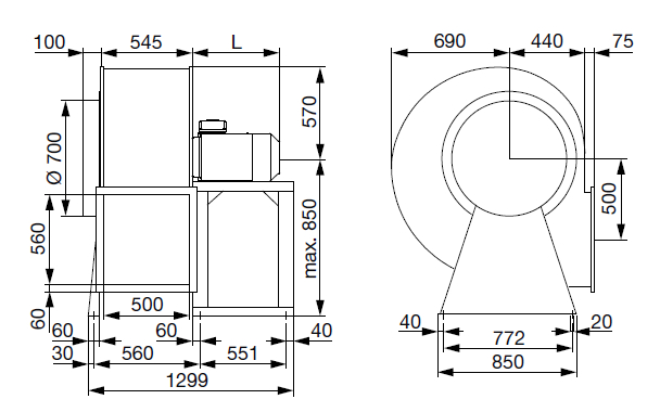 ![]() | Motor 2, 4 nebo 6 pólový jednofázový nebo třífázový asynchronní motor, třída izolace F, kuličková ložiska s tukovou náplní na dobu životnosti. Motor je umístěn mimo proud vzdušiny. Krytí IP55. Víceotáčkové provedení, provedení do prostředí s nebezpečím výbuchu nebo do venkovního prostředí na dotaz. | |