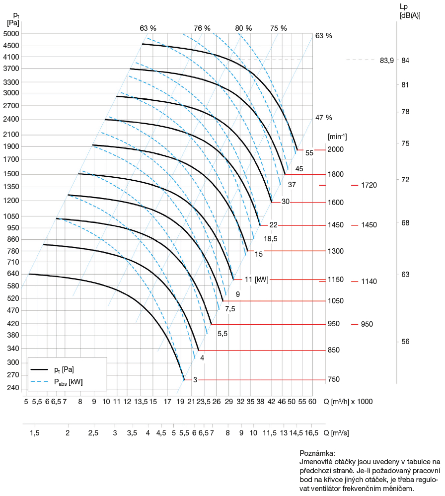Jmenovité otáčky jsou uvedeny v tabulce. Je-li požadovaný pracovní bod na křivce jiných otáček, je třeba regulovat ventilátor frekvenčním měničem.
