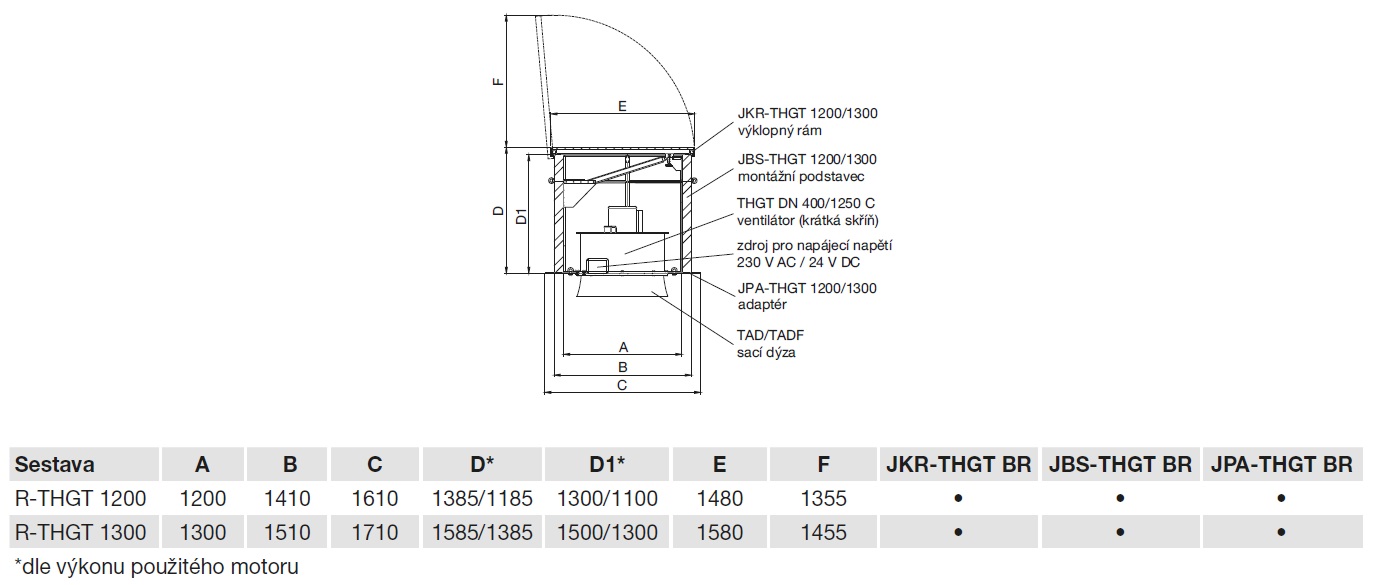 ![]() | Informace Sestava se skládá z montážní základny, ventilátoru, podstavce a uzavírací klapky. Uzavírací klapka je standardně vybavena servopohonem na 24 V DC. Alternativně lze osadit zdroj pro napájecí napětí 230 V AC nebo ovládací ústřednou (OU) s možností napojení na EPS. Servopohony je možno dodat ve variantě s vyvedenými signály od koncových spínačů (KS). V sestavách jsou integrovány ventilátory THGT dle výkonu a rozměru od DN 400 do DN 1120. • dvouplášťový montážní podstavec z ocelového pozinkovaného plechu s tepelnou izolací tloušťky 100 mm • montážní základna je ocelová s žárově zinkovaným povrchem s otvory pro přívodní kabely k ventilátoru a k servopohonu klapky • uzavírací klapka má rám z Al profilů a plechů, těsnění je EPDM, výplň z polykarbonátových desek barvy opál tloušťky 20 mm s U = 1,6 W/(m2K) nebo na zakázku 1,2 W/(m2K) • pohon klapky nesmí být trvale pod napětím • zapojení elektricky ovládané klapky a motoru konzultujte • klapku je možno doplnit zdrojem 230 V AC / 24 V DC umožňujícím ovládání pohonu klapky napětím 230 V AC, případně ovládací ústřednou (OU) s napojením na EPS • sestava s ventilátorem je určena k nucenému odvodu tepla a kouře při požáru a je testována dle EN 12101-3:2015 s klasifikací F400(120), F300(60) a F200(120) • sestavu s ventilátorem lze také používat pro provozní větrání, způsob použití konzultujte | |
