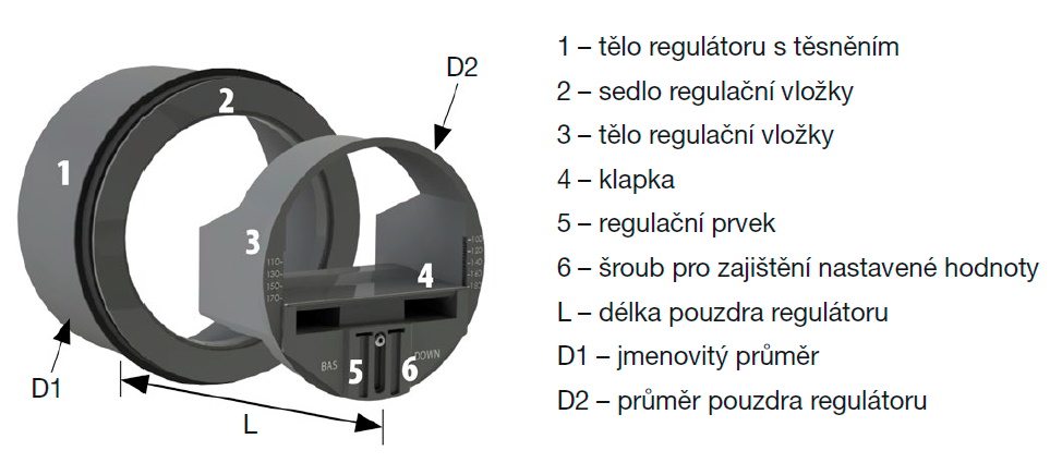 ![]() | Informace Regulátor je určen k vestavbě do potrubí zasunutím, slouží pro automatickou regulaci průtoku pro přívod nebo odvod vzduchu z kanceláří, v objektech bytové výstavby, školách atd. Zajišťuje konstantní hodnotu průtoku vzduchu nezávisle na tlakových podmínkách v potrubní síti. • pro přívod nebo odvod • jednoduchá konstrukce regulátoru • dobré regulační vlastnosti • snadné zaregulování rozsáhlých zařízení • snadné čištění a údržba • nízká hladina hluku • snadná instalace Konstrukce Regulátor průtoku se skládá z plastového tělesa a regulačního ústrojí, které je nastaveno na požadovaný průtok. Při zvětšení průtoku vzduchu vzroste rozdíl tlaků v regulátoru (odběry jsou na čelní ploše regulátoru), dojde k přivření klapky a tím ke zmenšení průtočného průřezu ventilu. Tím opět poklesne průtok na původní hodnotu. Instalace Regulátor průtoku vzduchu se instaluje zasunutím do potrubí v předepsané vzdálenosti od distribučního elementu. V odvodním potrubí je tato vzdálenost minimálně jednonásobek průměru regulátoru. V přívodním potrubí je tato vzdálenost minimálně trojnásobek průměru regulátoru. Utěsnění ve zděři nebo potrubí se provádí těsnicím kroužkem, který je součástí regulátoru na jeho obvodu. Před montáží je nutno zkontrolovat neporušenost kroužku. Montáž vodorovně i svisle. Nastavení požadovaného průtoku pomocí šroubu a stupnice na stranách regulační vložky. Upozornění