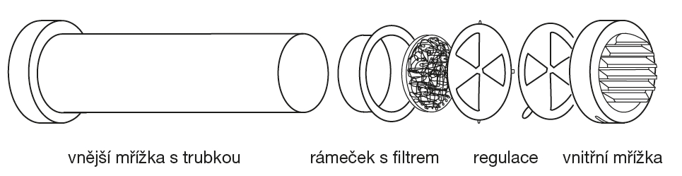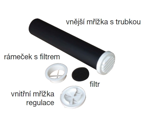 ![]() | Informace Ventily RIV jsou určeny pro přívod venkovního čerstvého vzduchu do místnosti s nuceným odvodem. Ventil je vyroben z ABS a skládá se z venkovní mřížky, rovné trubky a vnitřní regulovatelné mřížky s filtrem. Trubku je možné upravit na tloušťku zdi v rozsahu 50 až 400 mm. Regulace průtoku vzduchu se provádí páčkou na vnitřní mřížce, směr proudění lze ovlivnit natočením mřížky, která má šikmé lamely. Pro zvýšení vložného útlumu je možné použít vsuvný tlumič SGD mini 75. Tlakové ztráty a hodnoty vložného útlumu v závislosti na kmitočtu viz SGD 75 mini. | |
