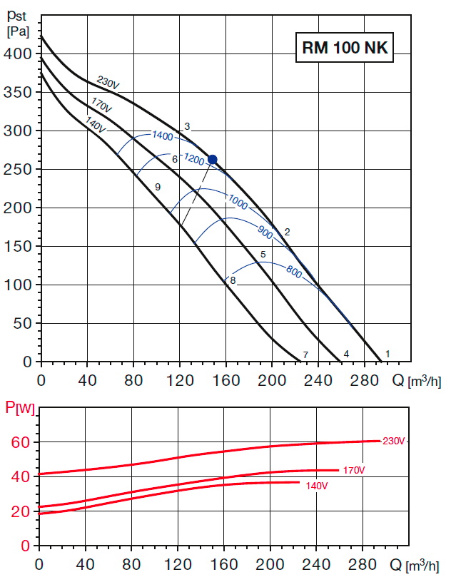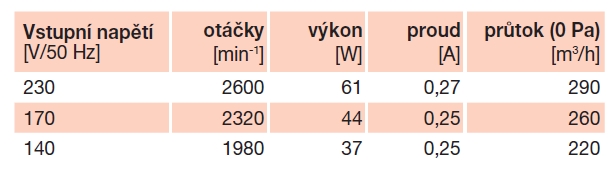 | otáčky [min-1] | výkon [W] | napětí [V] | proud [A] | max. teplota [°C] | průtok (0 Pa) [m3/h] | hmotnost [kg] | regulace | doběhový spínač | akust. tlak* [dB(A)] |