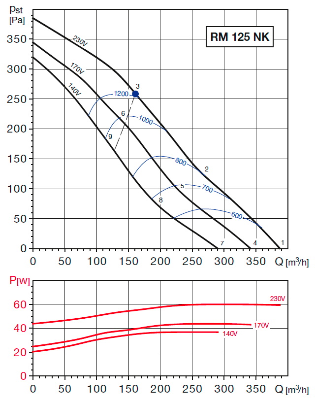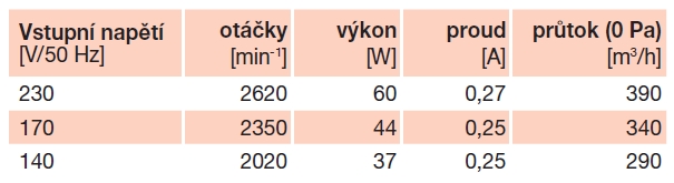 | otáčky [min-1] | výkon [W] | napětí [V] | proud [A] | max. teplota [°C] | průtok (0 Pa) [m3/h] | hmotnost [kg] | regulace | doběhový spínač | akust. tlak* [dB(A)] |