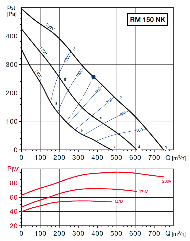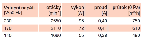 | otáčky [min-1] | výkon [W] | napětí [V] | proud [A] | max. teplota [°C] | průtok (0 Pa) [m3/h] | hmotnost [kg] | regulace | doběhový spínač | akust. tlak* [dB(A)] |