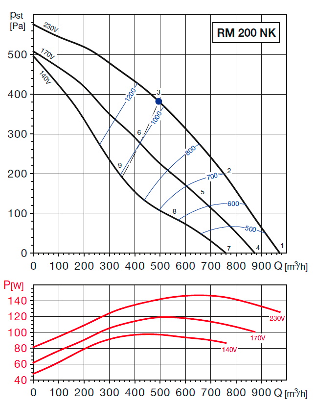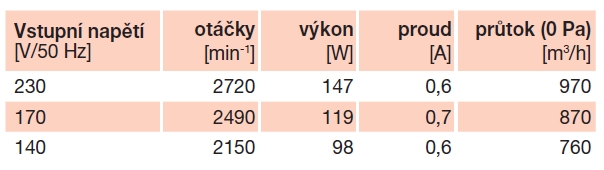 | otáčky [min-1] | výkon [W] | napětí [V] | proud [A] | max. teplota [°C] | průtok (0 Pa) [m3/h] | hmotnost [kg] | regulace | doběhový spínač | akust. tlak* [dB(A)] |
