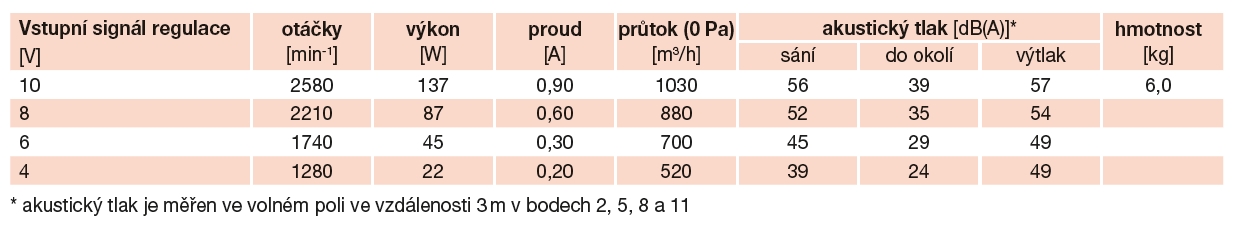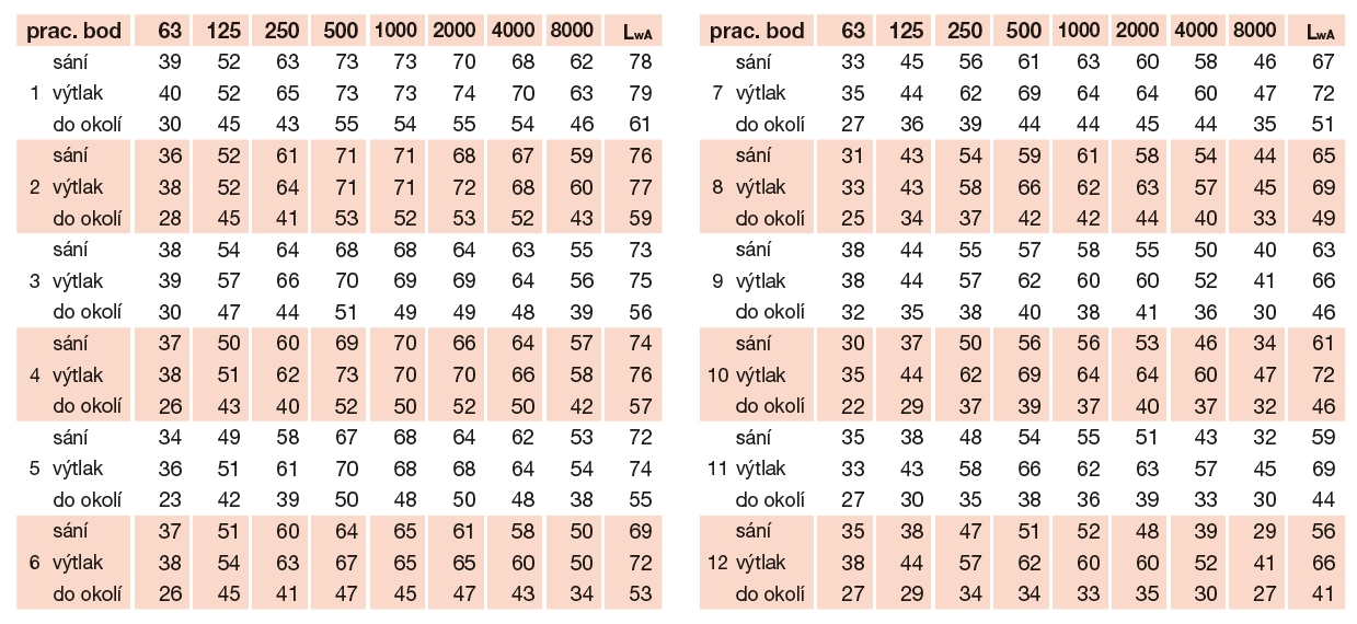 * akustický tlak je měřen ve volném poli ve vzdálenosti 3 m v pracovním bodě 2 výkonové charakteristiky (sání/do okolí/výtlak)