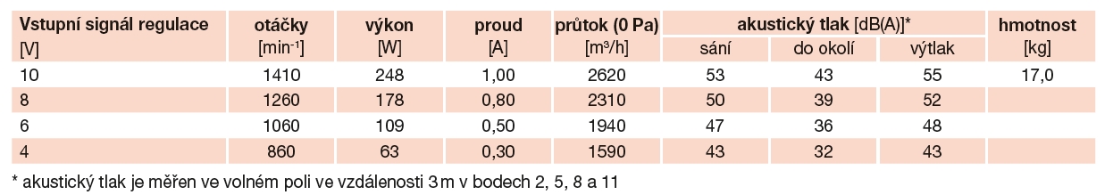 | otáčky [min-1] | výkon [W] | napětí [V] | proud [A] | průtok (0 Pa) [m3/h] | akust. tlak* [dB(A)] | hmotnost [kg] | regulace |