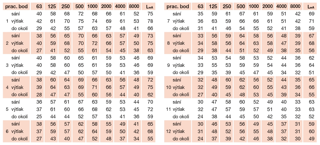 * akustický tlak je měřen ve volném poli ve vzdálenosti 3 m v pracovním bodě 2 výkonové charakteristiky (sání/do okolí/výtlak)