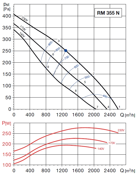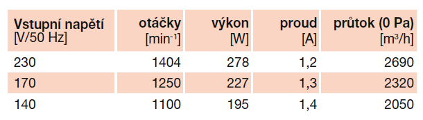 | otáčky [min-1] | výkon [W] | napětí [V] | proud [A] | max. teplota [°C] | průtok (0 Pa) [m3/h] | hmotnost [kg] | regulace | doběhový spínač | akust. tlak* [dB(A)] |