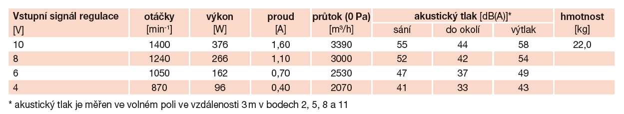 | otáčky [min-1] | výkon [W] | napětí [V] | proud [A] | průtok (0 Pa) [m3/h] | akust. tlak* [dB(A)] | hmotnost [kg] | regulace |