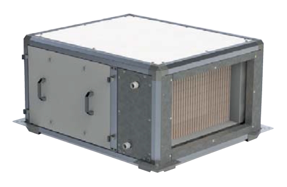 ![]() | Ventilátory Stěnové panely tloušťky 45 mm jsou vyrobeny z ocelového pozinkovaného plechu s vnějším lakováním v odstínu RAL 9002. Panely jsou uvnitř vyplněné zvukovou a tepelnou izolací z nehořlavé skelné minerální vlny. Pro usnadnění servisu je skříň jednotky vybavena snímatelnými dveřmi se zámky. Rám jednotky je vyroben z hliníkových profilů, stěnové panely jsou do rámu přišroubovány. Připojovací hrdla vodních ohřívačů jsou vyvedena na vnější plášť jednotky. Skříň je opatřena 4 kusy závěsů s otvory Ø 12 mm pro podstropní montáž jednotky. | |