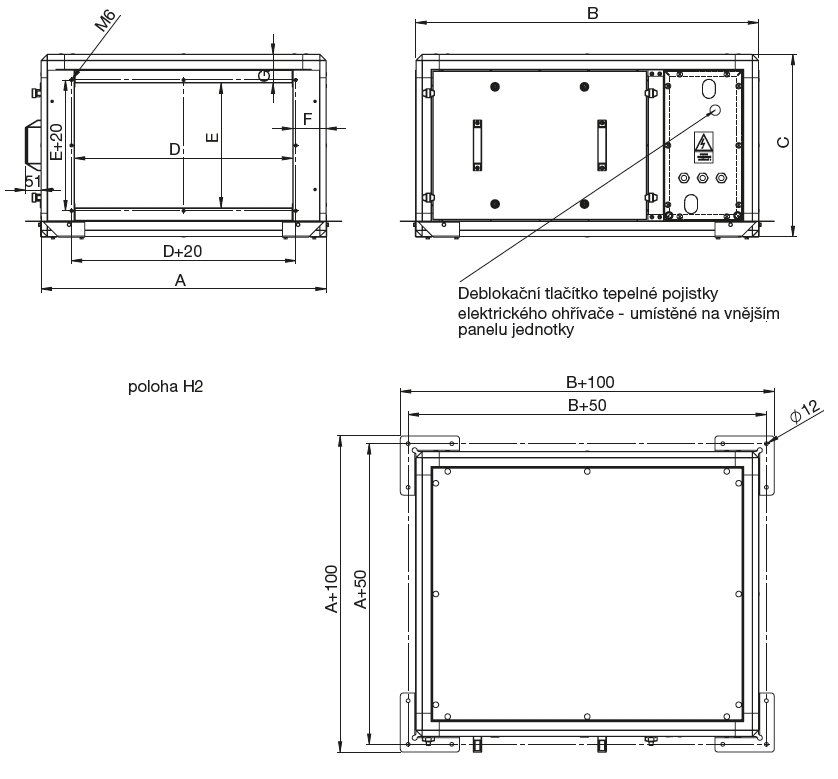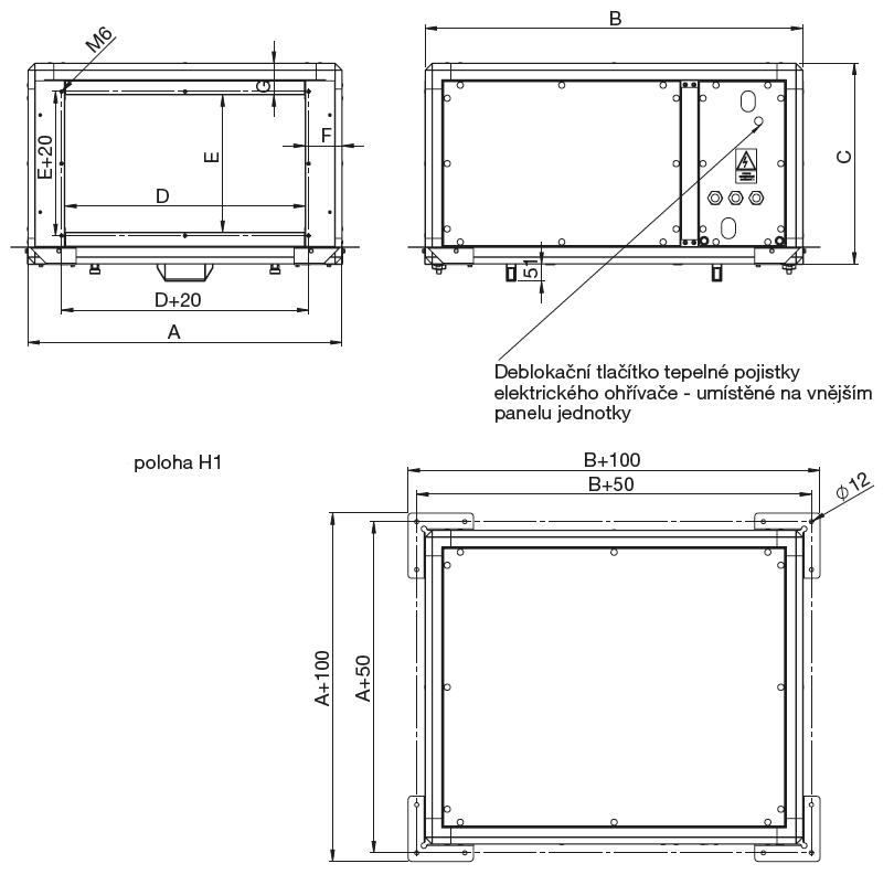 ![]() | Montáž Montáž je možná v horizontální poloze s obslužnou stranou z boční strany jednotky (označení v kódu jednotky H2) nebo ze spodní strany jednotky (označení v kódu jednotky H1). Dále je možné rozlišit pravé (P) a levé provedení (L) dle pozice vývodů vodního ohřívače nebo pozice připojovací svorkovnice elektrického ohřívače (pro vel. 2400, 3000, 4000, 6000). Pozice L nebo P se určuje při pohledu na čelní vstupní plochu ohřívače ve směru proudění vzduchu. Vedle jednotky je třeba mít manipulační prostor pro sejmutí víka a vyjmutí filtrů a pro provádění periodických revizí elektroinstalace. | |