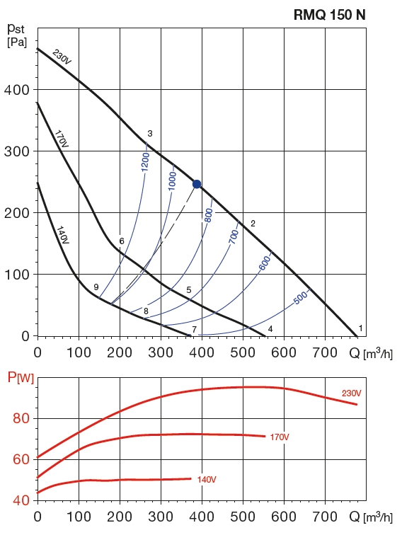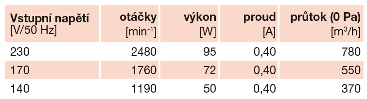| otáčky [min-1] | výkon [W] | napětí [V] | proud [A] | max. teplota [°C] | průtok (0 Pa) [m3/h] | hmotnost [kg] | regulace |