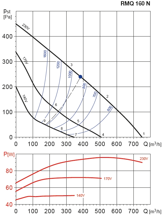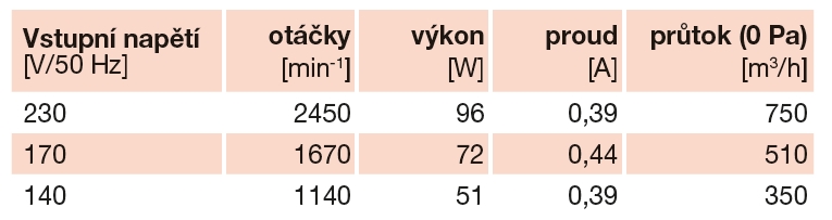 | otáčky [min-1] | výkon [W] | napětí [V] | proud [A] | max. teplota [°C] | průtok (0 Pa) [m3/h] | hmotnost [kg] | regulace |
