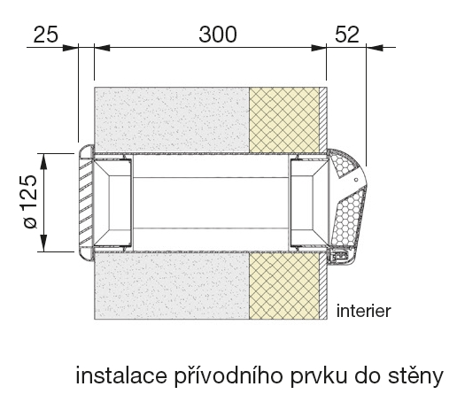 ![]() | Informace • montáž přívodního prvku se provádí do stěny • prvek obsahuje vnější a vnitřní mřížku s tlumící vložkou • mřížky se zasunují do kruhového potrubí o průměru 125 mm a délky 300 mm • průtok vzduchu 22 a 30 m3/h | |