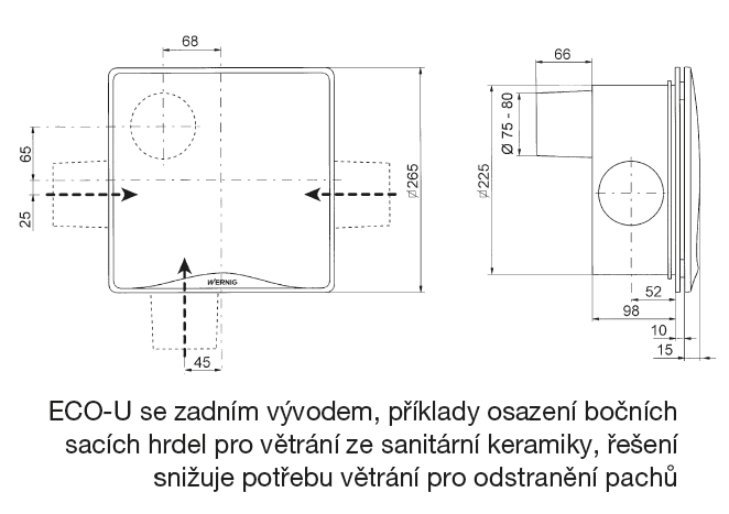 ![]() | Skříň Skříň je z ABS, barva bílá. ECO-A má výtlak směrem dozadu, průměr výtlačného hrdla je 78 mm. ECO-U má výtlak dozadu (Z) nebo nahoru (H), pro potrubí s průměrem 75–80 mm. ECO-A F90 má výtlak zadního vývodu pro průměr 100 mm. Na výtlaku je zpětná klapka. Montáž je na stěnu, pod omítku nebo do podhledu. Čelní mřížka obsahuje filtr a tlumič hluku. | |