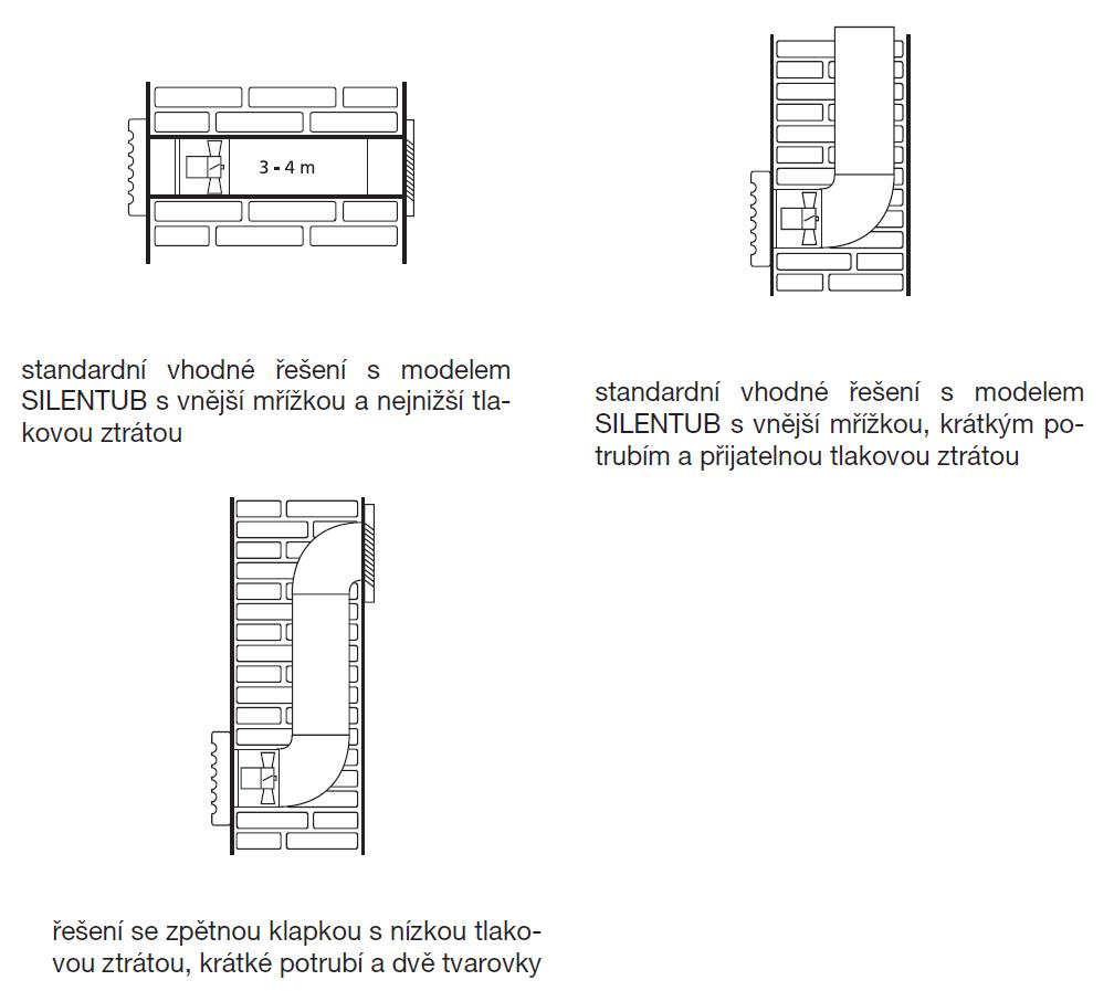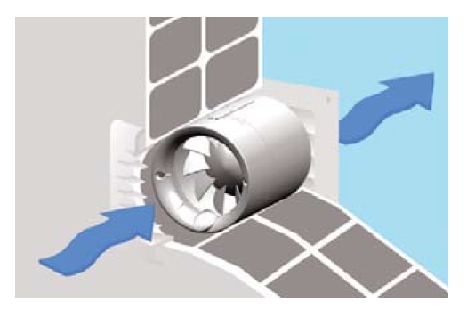 ![]() | Montáž Lze montovat v libovolné poloze, ale tak aby v nečinnosti ventilátoru byla mechanická klapka uzavřena. Vsouvá se do stěny nebo potrubí, případně se pomocí manžety PIE 100/120 přichytí na stěnu či strop. | |