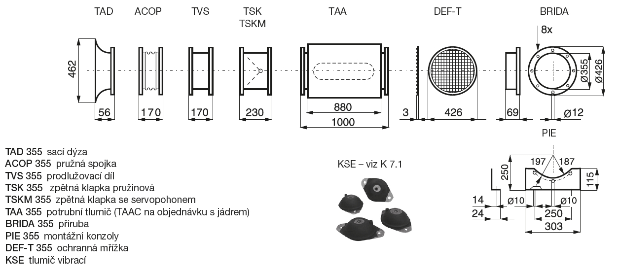 ![]() | Oběžné kolo Oběžné kolo je z hliníkové slitiny (6-355) nebo z ocelového plechu nalisované přímo na motoru (4-355). Oběžné kolo je staticky a dynamicky vyváženo dle ISO 1940, rozsah pracovních teplot je v rozmezí -40 až +40 °C. | |