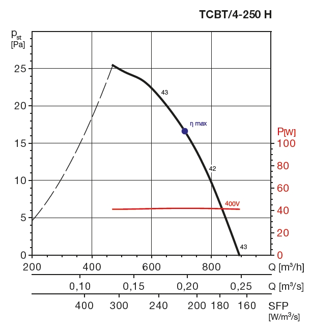 | otáčky [m-1] | průtok (0 Pa) [m3/h] | výkon [W] | napětí [V] | proud [A] | max. teplota [°C] | akustický tlak* [dB(A)] | hmotnost [kg] | regulátor |