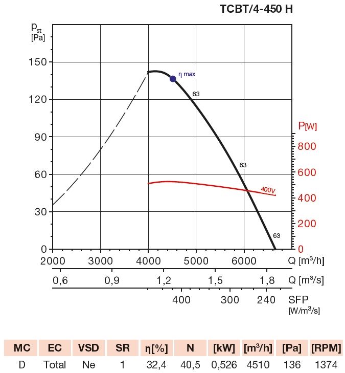 | otáčky [m-1] | průtok (0 Pa) [m3/h] | výkon [W] | napětí [V] | proud [A] | max. teplota [°C] | akustický tlak* [dB(A)] | hmotnost [kg] | regulátor |