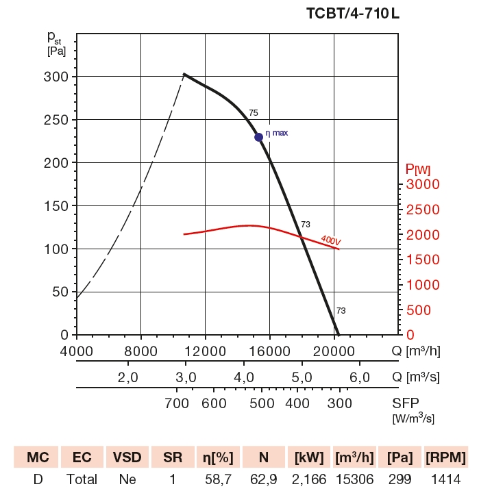 | otáčky [m-1] | průtok (0 Pa) [m3/h] | výkon [W] | napětí [V] | proud [A] | max. teplota [°C] | akustický tlak* [dB(A)] | hmotnost [kg] | regulátor |