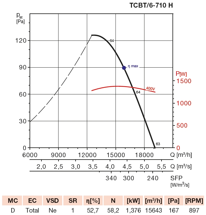 | otáčky [m-1] | průtok (0 Pa) [m3/h] | výkon [W] | napětí [V] | proud [A] | max. teplota [°C] | akustický tlak* [dB(A)] | hmotnost [kg] | regulátor |