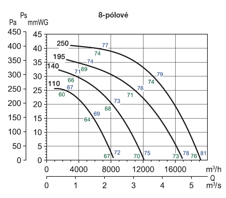 | 7500 m3/h - výtlak | 62 | 70 | 74 | 78 | 77 | 76 | 74 | 71 |